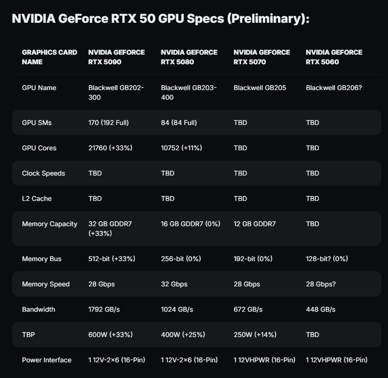 Theo các thông tin rò rỉ, RTX 5090 được thiết kế với GPU GB202-300-A1, tích hợp 170 đơn vị SM (Streaming Multiprocessors) trên tổng số 192 đơn vị, mang lại 21.760 lõi CUDA. Mặc dù số lượng lõi được kích hoạt không đạt mức tối đa, sản phẩm vẫn được đánh giá là một bước tiến lớn nhờ cải thiện về cấu trúc vi mô và hiệu quả hoạt động. Ngoài ra, GPU này sẽ sử dụng quy trình sản xuất 4nm cải tiến của TSMC, giúp tăng mật độ bán dẫn và giảm mức tiêu thụ điện năng.