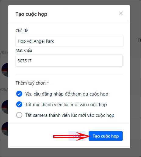Lúc này hiển thị giao diện tạo cuộc họp. Mỗi một cuộc họp sẽ đều có mật khẩu để thiết lập chế độ bảo mật và kèm thêm một số thiết lập micro và webcam.