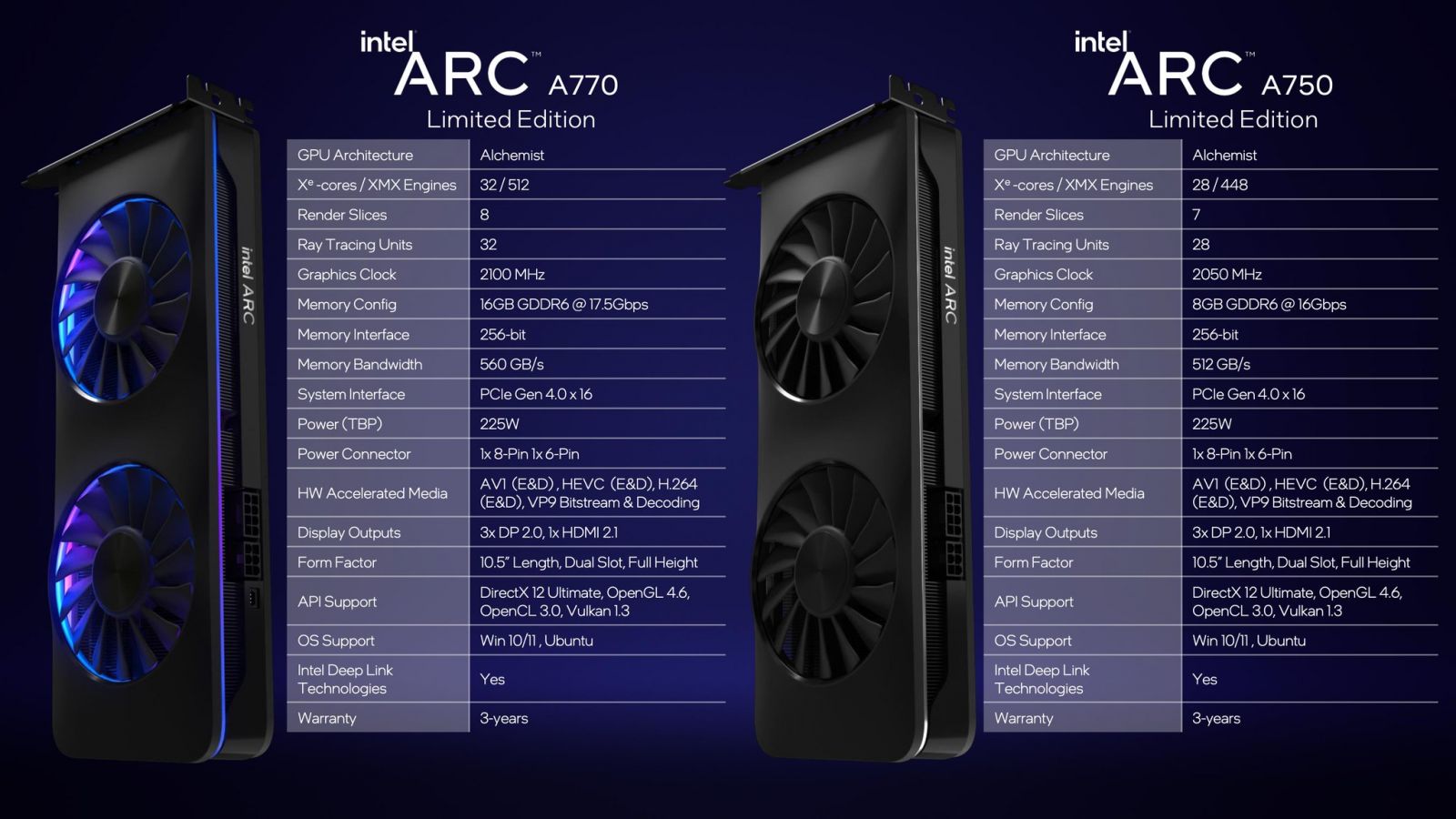 GPU trên sẽ có 2 phiên bản là 8GB và 16GB (có lẽ giá $329 chỉ dành cho phiên bản 8GB). CEO Pat Gelisnger đặc biệt nhấn mạnh: "Mặc dù đây là phiên bản mạnh mẽ nhất của GPU đầu tay của Intel, nhưng nó sẽ cạnh tranh ở phần dưới của phân khúc tầm trung so với các sản phẩm của Nvidia và AMD". Từ những gì chúng ta đã thấy cho đến nay, Arc A770 sẽ cạnh tranh với GeForce RTX 3060 và Radeon RX 6600 XT, cả hai đều có giá bán lẻ khoảng 350 USD đến 400 USD trên thị trường hiện nay.