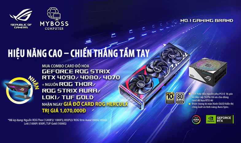 • Tặng giá đỡ card ROG HERCULX trị giá 1,040,000đ khi mua Card đồ hoạ ROG Strix 4090/ 4080/ 4070 series + Nguồn ROG Thor (1200P2, 1000P2, 850P2)/ ROG Strix Aura (1000G/ 850G)/ ROG Loki (1000P/ 850P)/ TUF Gold (1000G)