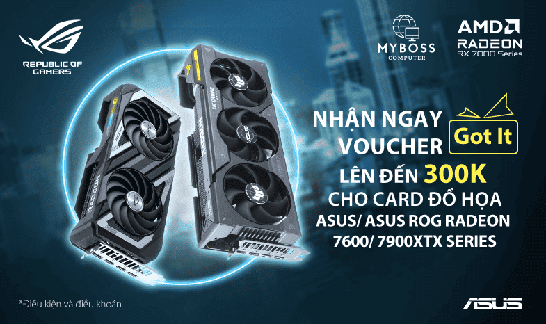 MYBOSS phối hợp cùng ASUS hân hạnh gửi tới quý khách chương trình khuyến mại “NHẬN NGAY VOUCHER LÊN ĐẾN 300K KHI MUA CARD ĐỒ HỌA ASUS AMD RADEON RX7600/ 7900XTX SERIES”