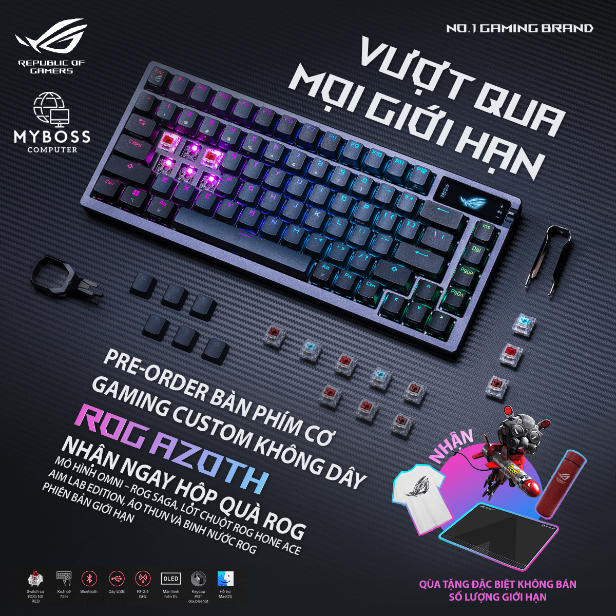 MYBOSS phối hợp cùng ASUS hân hạnh gửi tới quý khách chương trình khuyến mại “ROG AZOTH - VƯỢT QUA MỌI GIỚI HẠN”.