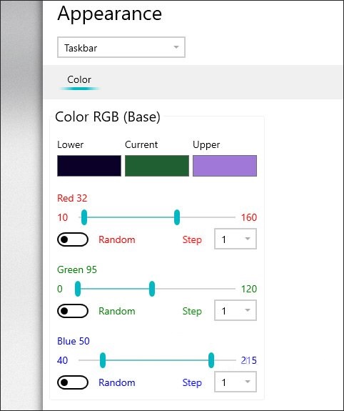 Hiển thị giao diện thiết lập đổi màu cho thanh Taskbar trên Windows 10. Ứng dụng sẽ thay đổi luân phiên giữa 3 màu sắc do bạn thiết lập lựa chọn màu và thay đổi các gam màu giữa 3 màu sắc. Bạn sẽ chỉ được đổi màu tại phần Lower và Upper, còn phần màu Current cố định không thể thay đổi.
