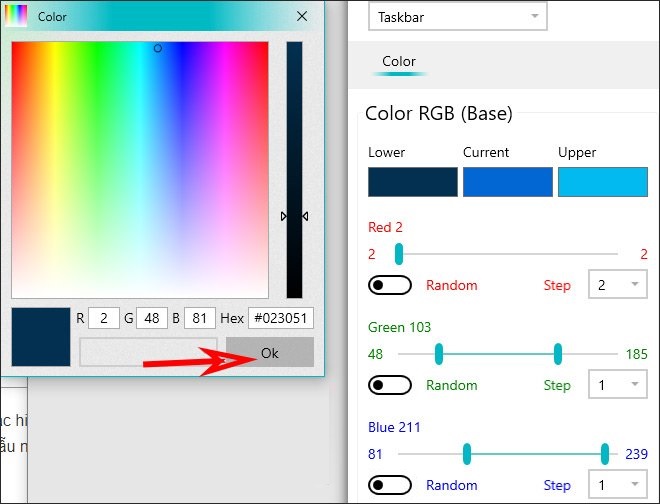 Lúc này hiển thị bảng mã màu để người dùng lựa chọn màu sắc trong bảng màu rồi nhấn OK để lưu lại. Ngay lập tức thanh Taskbar sẽ được đổi màu do bạn đã chọn và sau đó đổi màu ngẫu nhiên.