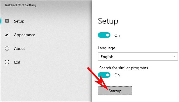Để hiển thị màu sắc tự động cho thanh Taskbar ngay khi mở máy tính, bạn nhấn vào Setup > Startup để ứng dụng khởi động cùng Windows.