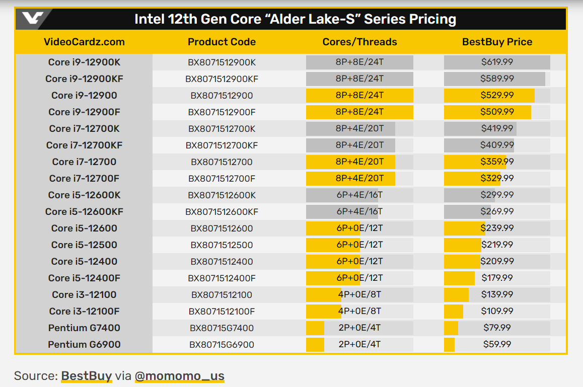 BestBuy đã tiết lộ một số bộ vi xử lý Intel Core thế hệ thứ 12 có tên mã Alder Lake-S với nhiều phiên bản tiếp theo. Đây là các CPU non-K (không thể ép xung) với mức TDP 65W. Theo đó bộ xử lý Core i9-12900 16 lõi (hỗ trợ 24 luồng lệnh) sẽ có giá từ 510 USD đến 530 USD, tùy thuộc vào tính có sẵn của lõi đồ họa tích hợp. Giá này rẻ hơn khoảng 60 USD so với dòng K chuyên ép xung. Đồng thời, bộ xử lý Core i7-12700 12 lõi (20 luồng) có giá 360 USD và tăng lên đến 420 USD. Chúng dự kiến sẽ chính thức phát hành vào ngày 5.1.2022.