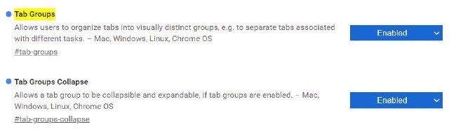 Lưu ý: Nếu sau khi cập nhật bạn vẫn chưa sử dụng được tính năng nhóm tab thì bạn cần phải làm một số thao tác để kích hoạt. Cụ thể, bạn cần nhập “chrome://flags/#tab-groups” vào thanh địa chỉ của Chrome và nhấn Enter. Trong màn hình mới hiện ra, chọn Enabled cho hai mục đầu tiên là Tab Groups và Tab Groups Collapse sau đó khởi động lại Chrome.