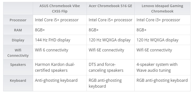 Dưới đây là tổng quan về thông số kỹ thuật của Lenovo Ideapad Gaming Chromebook, Acer Chromebook 516 GE và Asus Chromebook Vibe CX55 Flip: