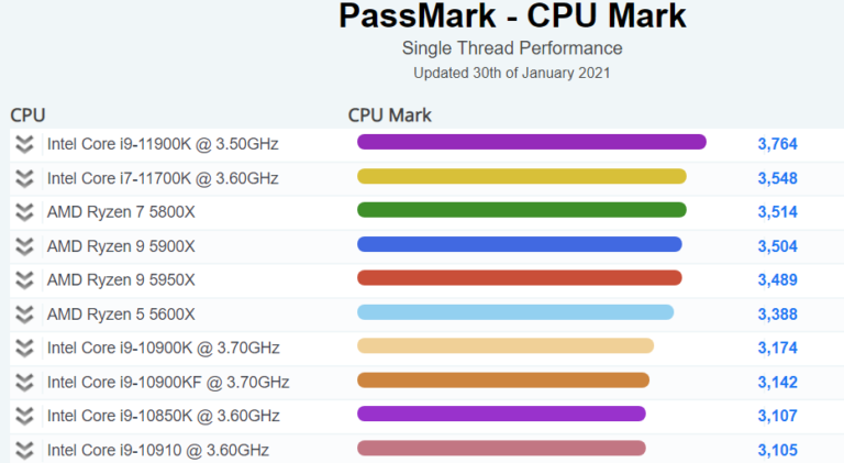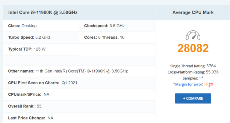 Theo PassMark, CPU này đạt 3.764 điểm trong CPU Mark (hiệu năng đơn luồng), nhanh hơn 7% so với Ryzen 7 5800X dựa trên kiến trúc Zen3. Ngay phía dưới là CPU Ryzen nhanh nhất trong bảng xếp hạng. Quan trọng hơn, có sự cải thiện gần 19% về hiệu suất đơn luồng so với CPU Core i9-10900K. So với Core i7-11700K, cũng là SKU 8 lõi Rocket Lake-S nhưng không có Thermal Velocity Boost, 11900K chỉ nhanh hơn 6%.