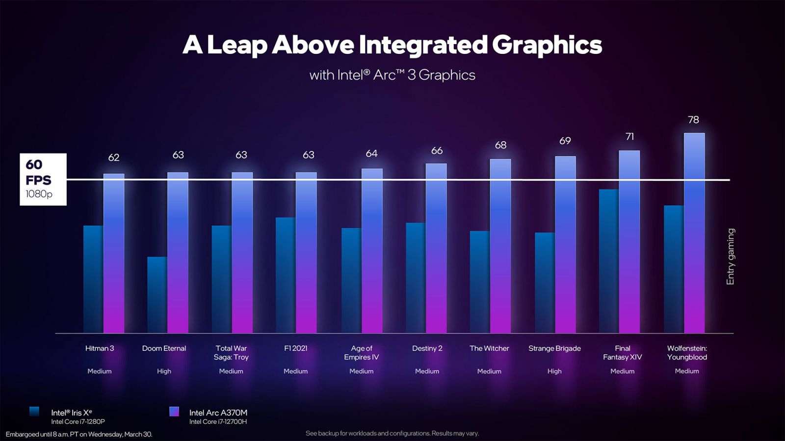 Hiệu năng của Arc A-series cũng đã được Intel tiết lộ nhưng chỉ mới dòng Arc 3. A370M cho tỉ lệ khung hình trên 60 fps đối với các tựa game được test gồm Hitman 3, Doom Eternal, Total War Saga Troy, F1 2021, Age of Empires IV, Destiny 2, The Witcher, Strange Brigade, Final Fantasy XIV và Wolfenstein: Youngblood khi chơi ở các thiết lập đồ họa Medium và High, phân giải 1080p.