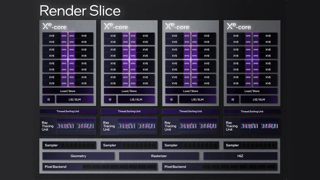 Gắn trên mỗi XVE (Xe vector engine, trước đây còn được gọi là execution unit) là engine ma trận XMX rất là giống với Nvidia Tensor Core phiên bản thu nhỏ, và mỗi nhân Xe đều có ray tracing unit riêng. Khá là thú vị vì ngay cả GPU Arc thấp nhất cũng có phần cứng ray tracing, câu hỏi được đặt ra ở đây là chúng sẽ được tận dụng như thế nào.