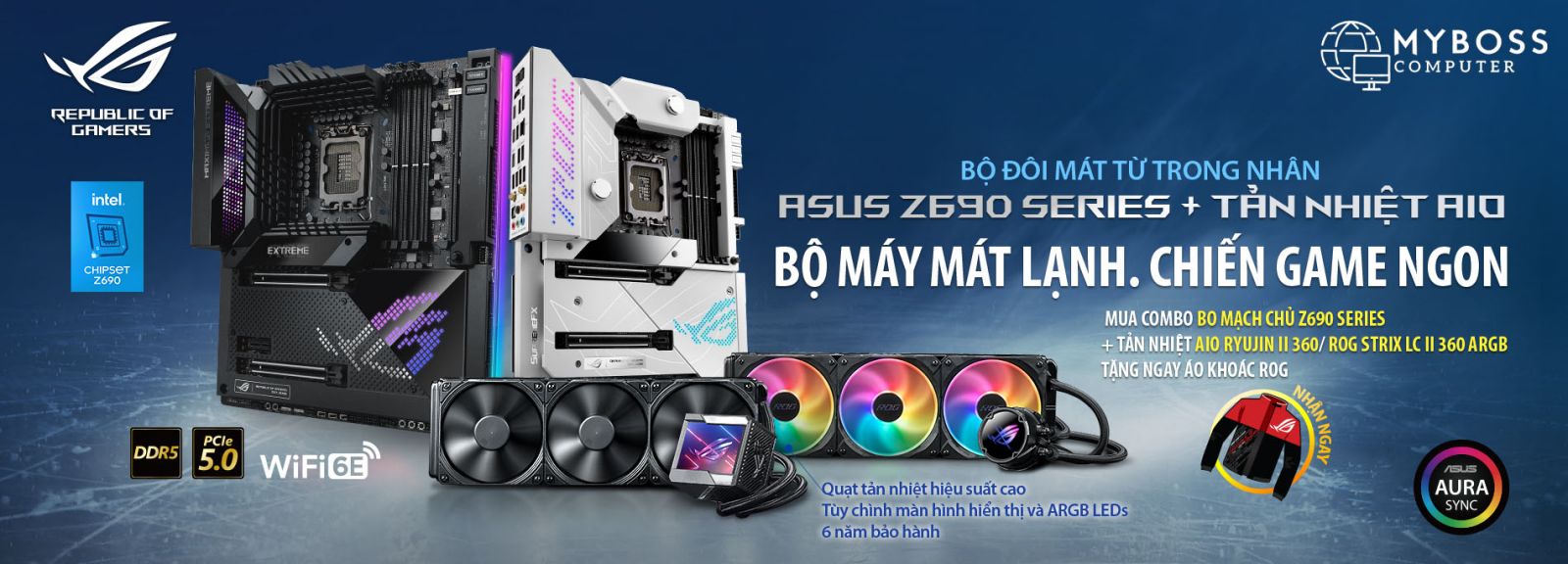 - Tặng áo khoác ROG khi mua combo Bo mạch chủ Z690series + tản nhiệt AIO Ryujin II 360 hoặc ROG STRIX LC II 360 ARGB