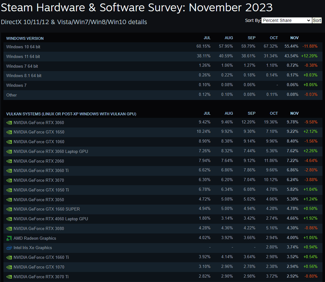 Khảo Sát Phần Cứng Steam Tháng 11.2023: Hơn 42% người dùng Steam đang sử dụng Windows 11 !!