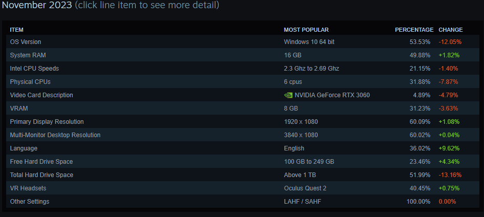Đáng chú ý, tháng 12 năm 2023 sẽ là tháng cuối cùng chúng ta thấy Windows 7, Windows 8 và Windows 8.1 trong báo cáo của Valve. Công ty sẽ cắt quyền truy cập đối với các nền tảng Windows cũ này trên Steam vào ngày 1 tháng 1 năm 2024.