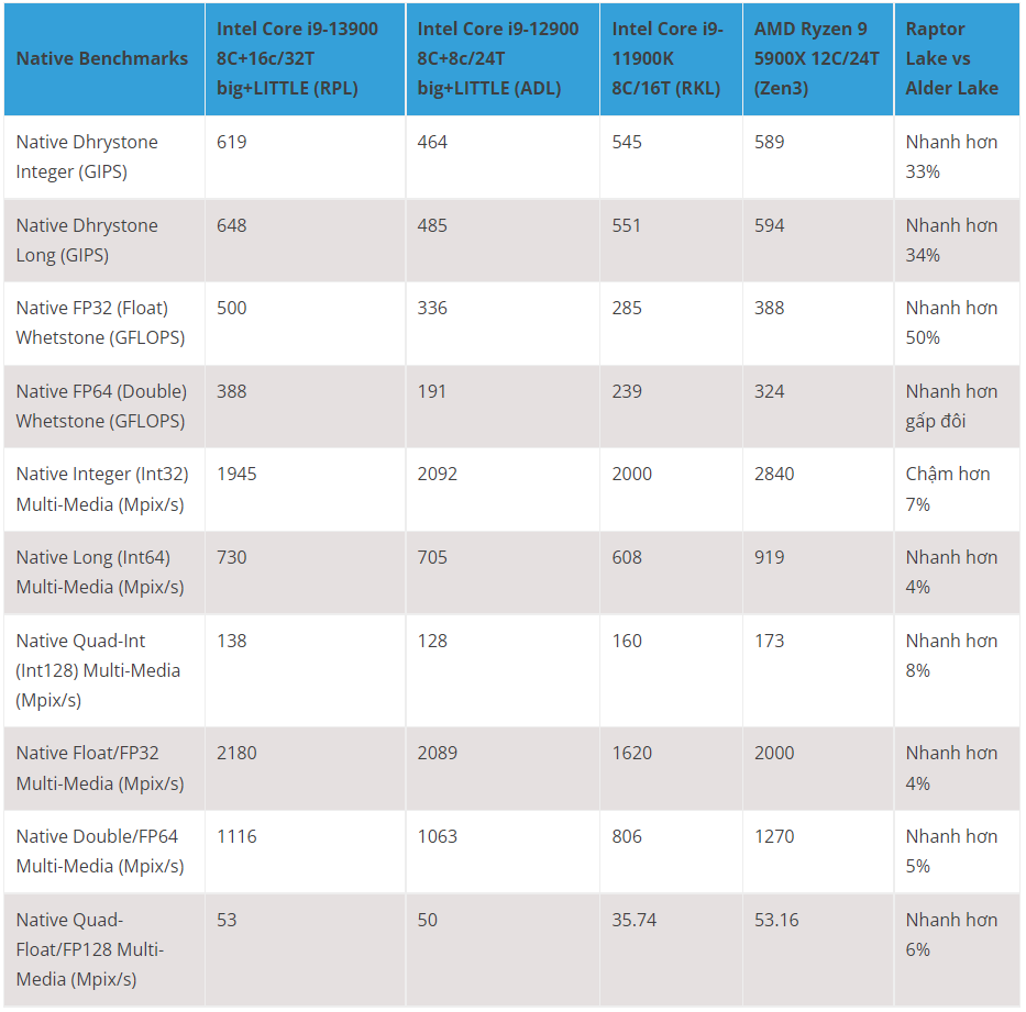- Trong các thử nghiệm ALU/FPU legacy, Raptor Lake nhanh hơn từ 33% đến 50% so với Alder Lake trong khi xung lại thấp hơn nhiều.