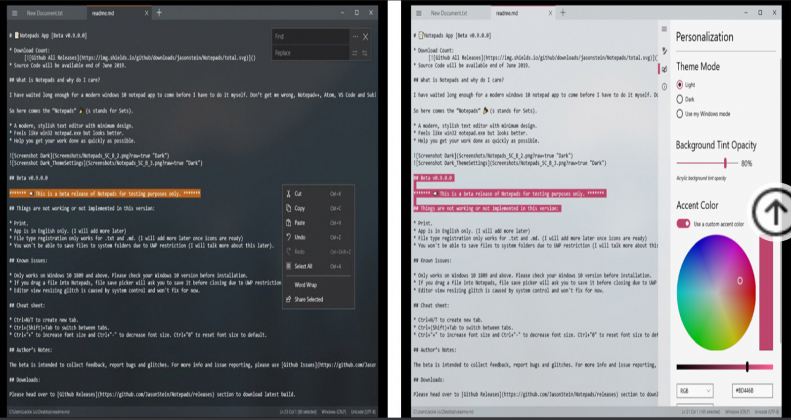 Notepads có giao diện khá đẹp mắt nhờ được thiết kế với ngôn ngữ thiết kế Fluent Design. Notepads cho phép người dùng có thể tùy chỉnh màu sắc, giao diện, font chữ, chế độ nền Light (sáng) hoặc Dark (tối) trong Settings.
