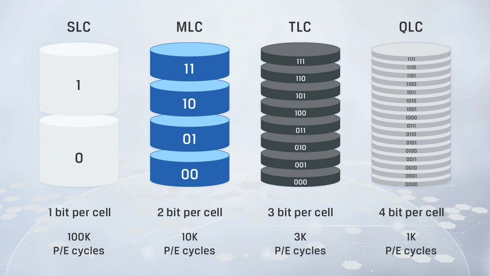 NAND flash là thành phần chủ yếu trên SSD để lưu trữ dữ liệu. Trong khi SSD dùng trong doanh nghiệp với nhu cầu cao về độ ổn định được trang bị SLC NAND flash (single-level cell) thì người dùng thông thường sẽ có MLC (multi-level cell) và TLC (triple-level cell). SLC có thể tồn tại ở 2 trạng thái, 0 và 1, vì thế mỗi cell chỉ chứa 1 bit dữ liệu; MLC có thể tồn tại ở 4 trạng thái, chứa 2 bit dữ liệu trên mỗi cell; TLC chứa 3 bit dữ liệu mỗi cell và 8 trạng thái. Càng nhiều bit, dữ liệu sẽ có tỉ lệ hỏng hóc nhiều hơn và độ ổn định cũng giảm đi. Trước đây thị trường chỉ có 2 lựa chọn là SLC và MLC, tuy nhiên từ khi Samsung 840 Series SSD ra mắt, TLC bắt đầu chiếm lĩnh do giá thành rẻ, dung lượng lớn, bù lại tốc độ không nhanh bằng MLC và SLC cũng như độ tin cậy không cao, tuổi thọ thấp, dễ xảy ra lỗi. Do đó, TLC dường như chỉ được sử dụng trong các thiết bị lưu trữ cho người dùng cuối.