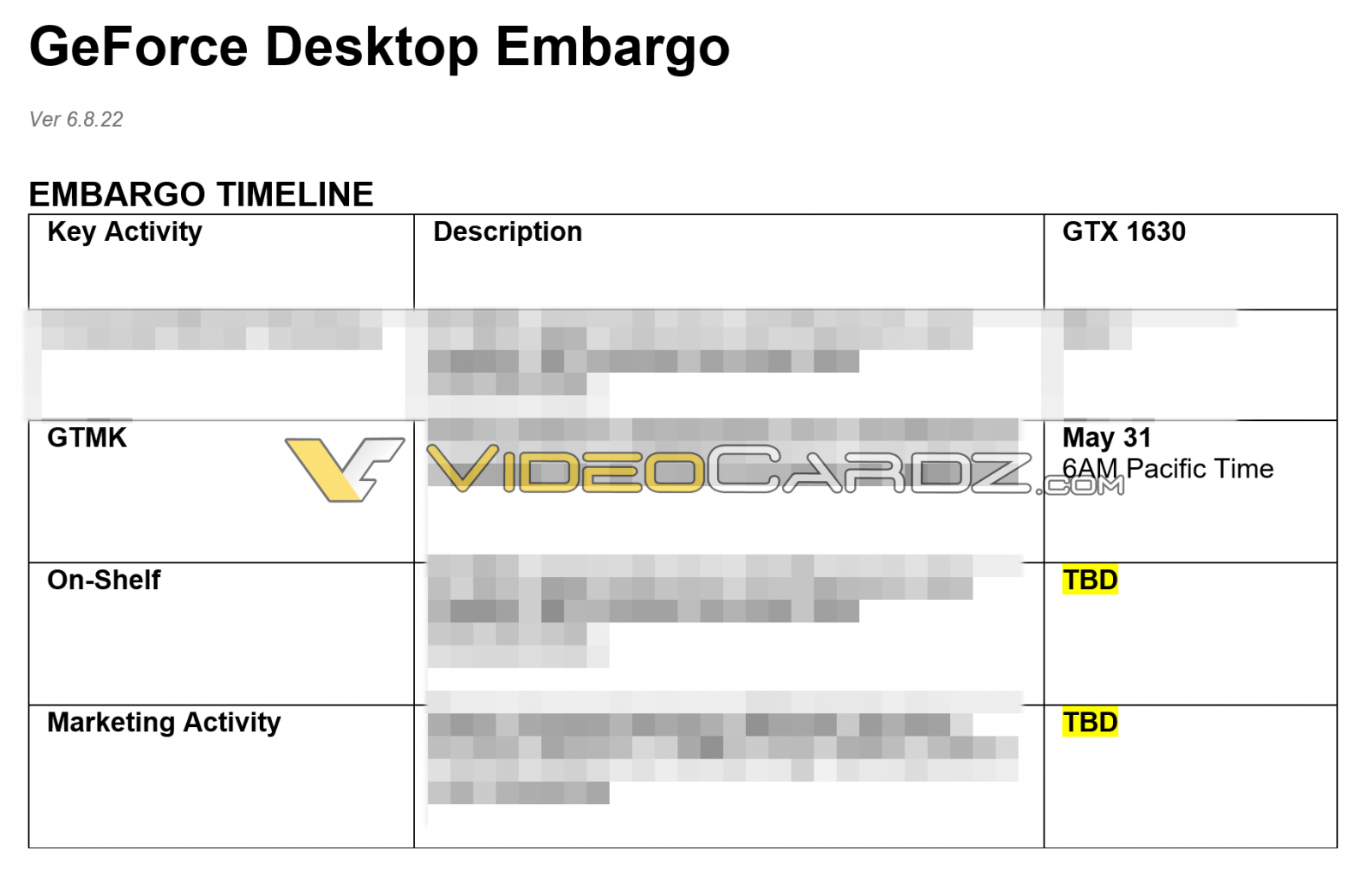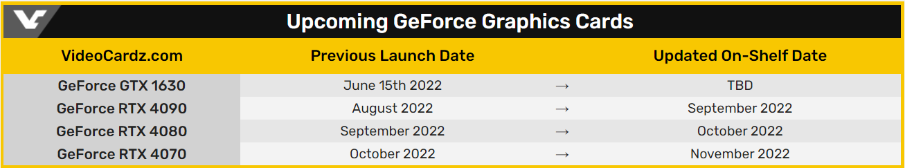 Mẫu card GTX 1630 cũng bị dời ngày ra mắt. Cuối tháng 5 vừa qua, GTX 1630 GTMK (Go To Market Kit) đã được cung cấp cho các đối tác sản xuất, và đã có những mẫu card giá rẻ này được hoàn thiện, kể cả thiết kế bao bì. Theo kế hoạch trước đây, GTX 1630 sẽ được giới thiệu trong tuần này, nhưng chỉ vài ngày trước, NVIDIA yêu cầu các đối tác sản xuất card phải tiếp tục giữ kín thông tin, và thời hạn mới vẫn chưa được xác định cụ thể. Lý do cho việc lùi ngày của GTX 1630 được giải thích là vì 1 số vấn đề về an ninh của các thành phần cần thiết (không phải GPU).