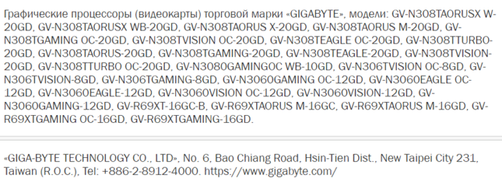 Tại Ủy ban Kinh tế Á-Âu, danh sách bao gồm nhiều mẫu khác nhau trong dòng Gaming và Eagle của Gigabyte cho cùng một dòng card đồ họa chính xác, với 12 GB và 20 GB được liệt kê một lần nữa. Không ít hơn mười ba card đồ họa RTX 3080 Ti và sáu card RTX 3060 12GB được liệt kê; trong số đó có các mẫu Aorus Xtreme, Aorus Master, Gaming, Vision và Eagle của RTX 3080 Ti kèm theo các bản sửa đổi đã được tinh chỉnh tại nhà máy.
