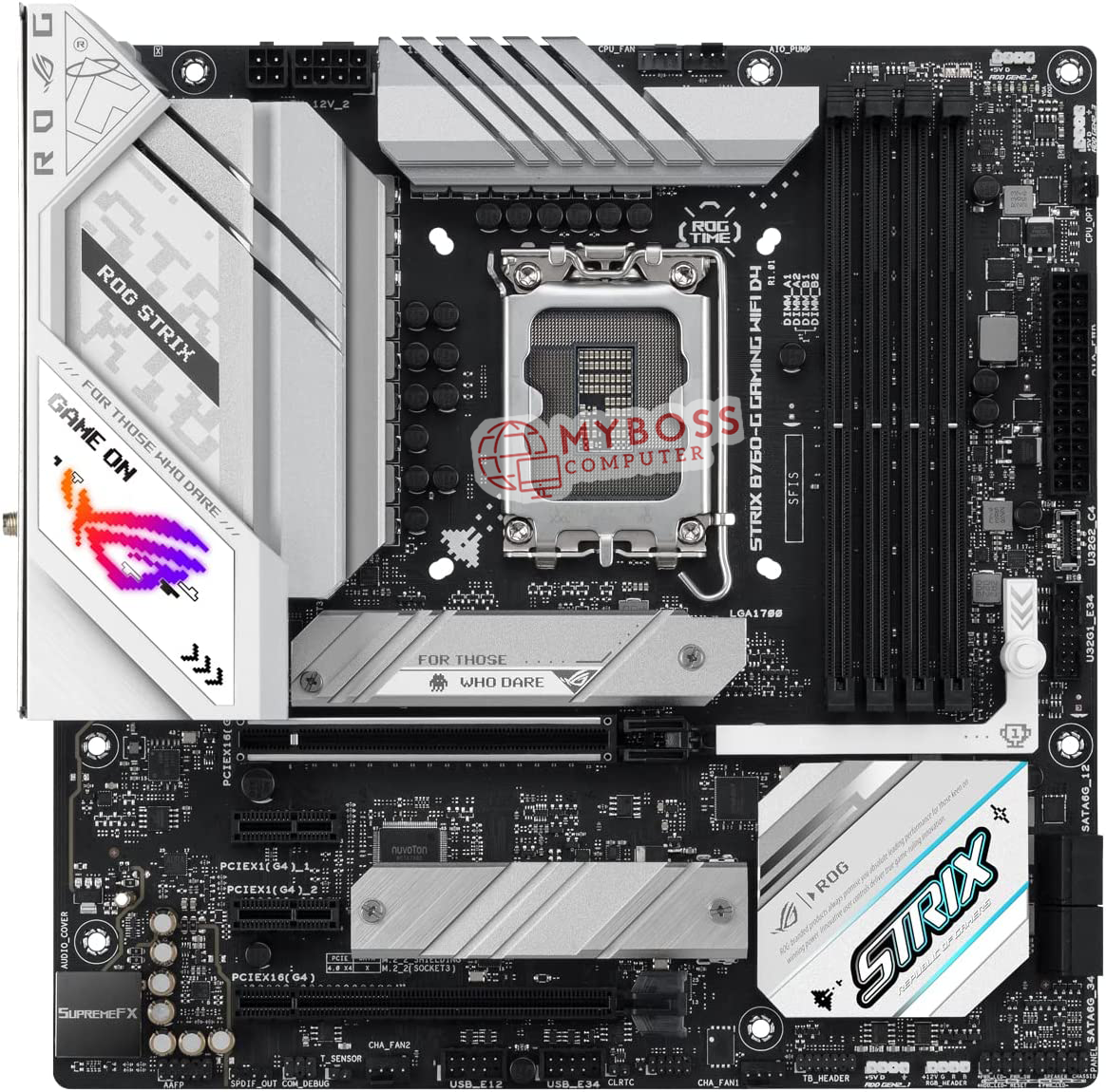 Đầu tiên, chúng ta có bo mạch chủ ASUS ROG STRIX B760-A Gaming WIFI DDR4 sở hữu kích thước ATX và dường như dàn VRM được thiết kế 16 pha với bố cục đầu nối nguồn 8 + 4 pin. Thiết bị sở hữu 1 khe cắm PCIe 5.0 x 16, PCIe 3.0 x 4 và PCIe 3.0 x 1.