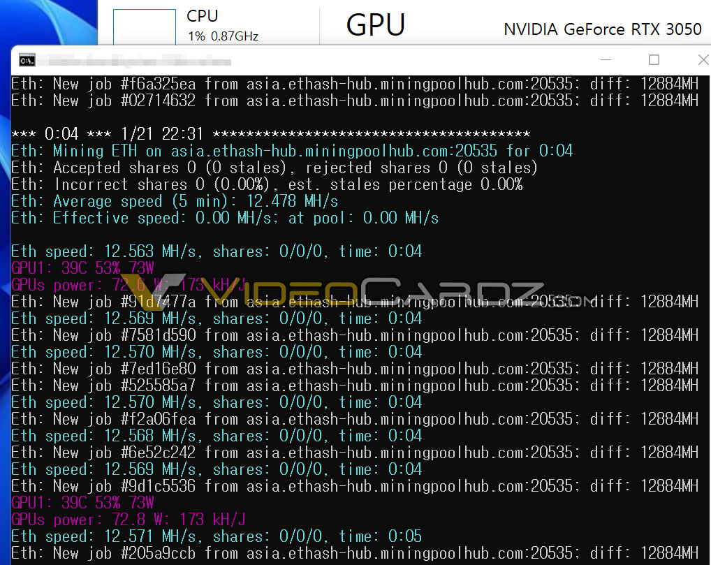 Một blogger công nghệ khác người Trung Quốc cũng đã cung cấp ảnh chụp màn hình trên mxh bilibili về kết quả đánh giá hiệu suất khai thác được cho là thuộc về GeForce RTX 3050. Trong trường hợp này, GPU đạt tốc độ 13,66MH/s ở 57W sau khi đã được tinh chỉnh và tối ưu hóa phần cứng.