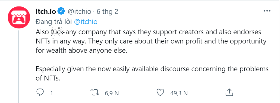 Chưa hết, Itch.io còn tiếp nối thông điệp này bằng một mẩu tweet khác có phần ngôn từ nặng nề hơn: “Đ* bất kỳ công ty nào nói rằng họ ủng hộ những người tạo nội dung và cũng thừa nhận NFT dưới bất kỳ hình thức nào. Họ chỉ quan tâm đến lợi nhuận của chính mình và sự giàu có hơn bất kỳ ai khác.”