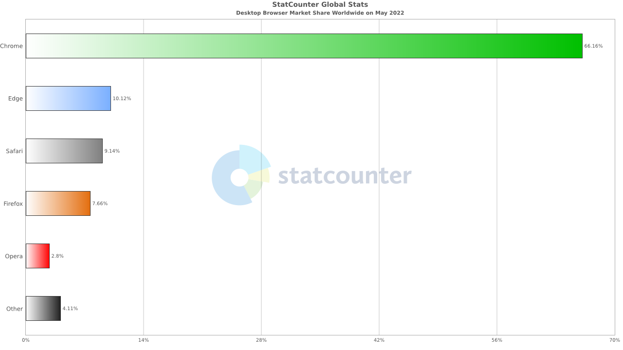 Báo cáo định kỳ tháng 5 năm 2022 từ Statcounter cho thấy Microsoft Edge vẫn đang vươn lên mạnh mẽ, ngày càng thu hút được nhiều người dùng hơn, với thị phần vẫn tiếp tục duy trì ở ngưỡng 2 chữ số. Tương tự, Safari cũng đã có màn thể hiện không tệ. Chrome tuy vẫn là cái tên thống trị, nhưng đã ghi nhận sự sụt giảm nhẹ về thị phần. Trong khi đó, Firefox tiếp tục “ngụp lặn” trong khủng hoảng mà chưa ghi nhận bất cứ dấu hiệu tích cực nào.