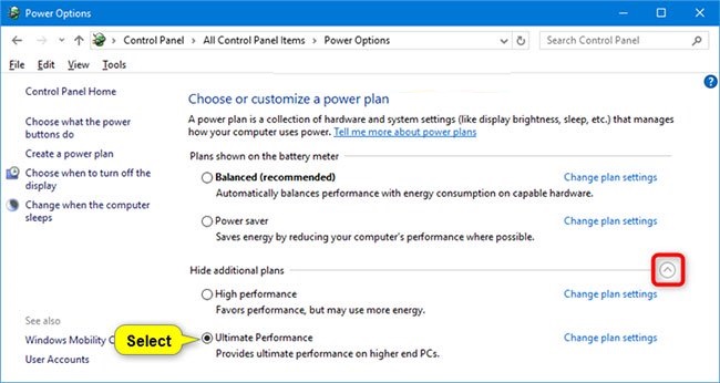 - Ultimate Performance (Hiệu suất tối ưu) - Chỉ khả dụng trong phiên bản Windows 10 Pro for Workstations, bắt đầu từ Windows 10 build 17101. Tùy chọn này cung cấp hiệu suất tối ưu trên các PC cao cấp. Nó được xây dựng dựa trên policy High-Performance hiện tại và tiến thêm một bước nữa để loại bỏ độ trễ siêu nhỏ, liên quan đến các kỹ thuật Fine Grained Power Management (quản lý điện năng cấp tiến trình).