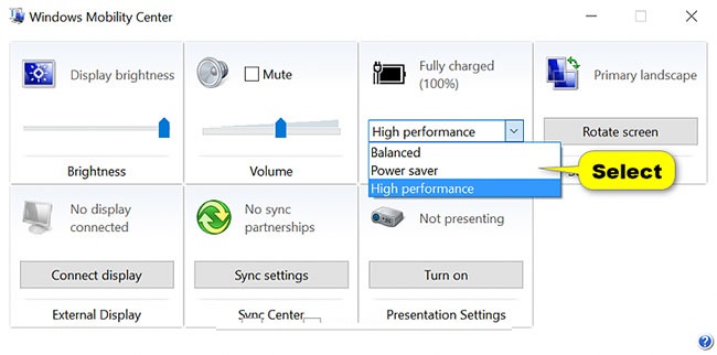 Chọn power plan trong Windows Mobility Center