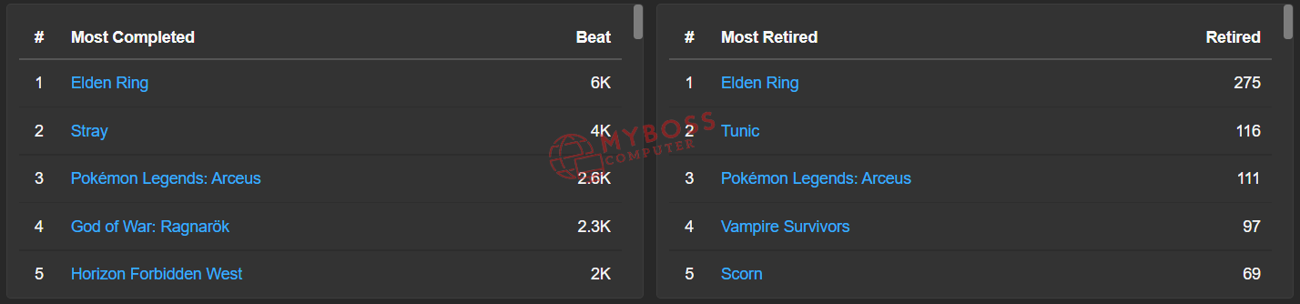Cụ thể, theo một thống kê trên trang web HowLongToBeat.com, Elden Ring gần như đã thống trị ở rất nhiều hạng mục nổi tiếng mà một trò chơi có thể dành được trong năm 2022. Từ việc là tựa game có doanh số bán ra tốt nhất, số người chơi nhiều nhất cho tới màn ra mắt ấn tượng nhất. Tất nhiên, việc sở hữu nhiều người chơi cũng đồng thời mang tới cho Elden Ring ngôi vị trò chơi được hoàn thành nhiều nhất của năm 2022, với hơn 6.000 báo cáo từ người chơi về việc họ đã phá đảo tựa game này. Con số khá ấn tượng nếu như biết rằng các trò chơi nổi tiếng khác như Stray chỉ có 4.000 người hoàn thành, hay hạng 3 là Pokemon Legends: Arceus được phá đảo bởi 2,6 nghìn game thủ.