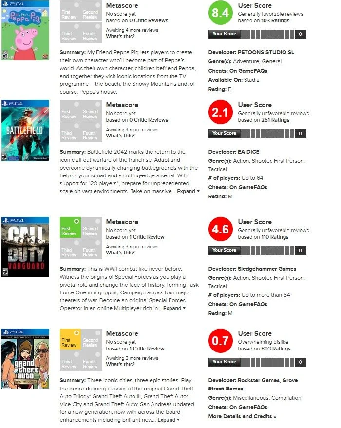 Việc Battlefield 2042 xuất hiện trong danh sách này như môt cú tát từ người chơi gửi đến EA, sau khi công bố Beta thử nghiệm mang về như đánh giá, góp ý tiêu cực cũng như tích cực, đa số cho rằng game nên lùi ngày phát hành để hoàn thiện và chăm chút lại hiệu năng cũng như vá lỗi. Nhưng EA quyết định cho ra mắt game sớm và kết quả là bản game chính thức chẳng khác gì bản Beta test cả !? Thậm chí trải nghiệm của đa số game thủ còn tệ hơn khi đang chơi Beta!