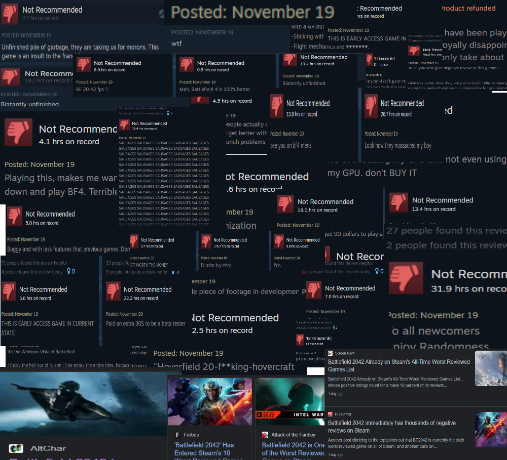 Game nhận về 2.1 điểm Metacritic và đương nhiên với hơn 40k đánh giá, trong đó hơn 29.000 là tiêu cực thì BF 2042 vinh dự được xếp vào "hàng ngũ những game vĩ đại nhất" trên Steam - đứng thứ 8/10 những game được người chơi đánh giá tệ nhất Steam!