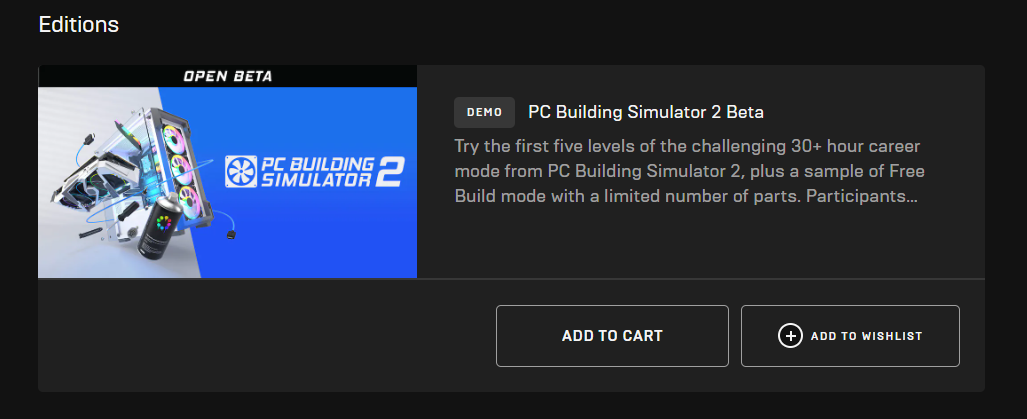 Hiện PC Building Simulator 2 vẫn còn đang trong giai đoạn thử nghiệm Beta, bạn có thể tham gia thử nghiệm trên Epic Games Store để giúp nhà phát triển hoàn thiện nó. Đặc biệt hơn là nếu tham gia, bạn sẽ có một vé giảm giá 15% khi bản chính thức ra mắt.