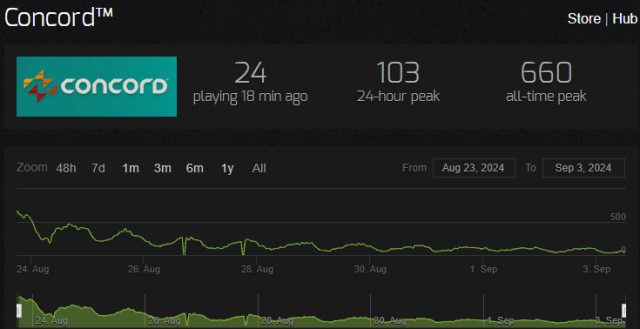 Ở thời điểm bài được viết, Concord đang có 24 người đang chơi, với lượng người chơi nhiều nhất trong 24 giờ qua nằm ở mức 103 người.