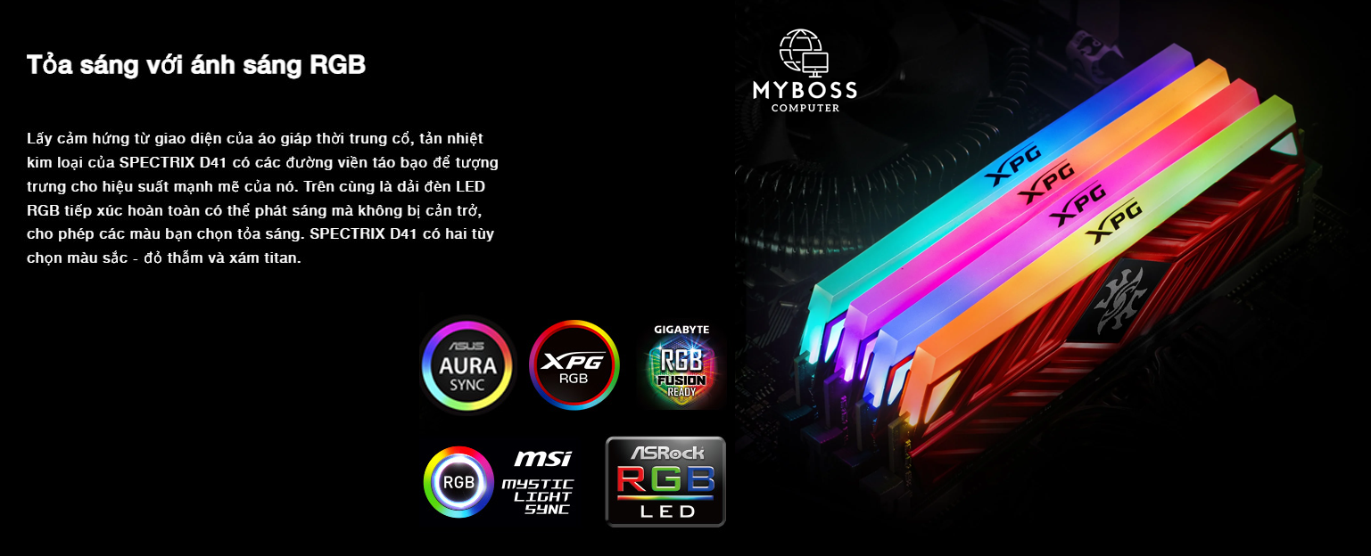XPG SPECTRIX D41 DDR4 RGB mang đến khả năng ép xung và chơi game mượt mà, nhanh chóng, đồng thời hỗ trợ cả nền tảng Intel và AMD Ryzen. Hơn thế nữa, với ánh sáng RGB sống động có thể đồng bộ với nhiều loại bo mạch chủ, bạn sẽ vượt trội so với đối thủ cả về trình độ và phong cách.