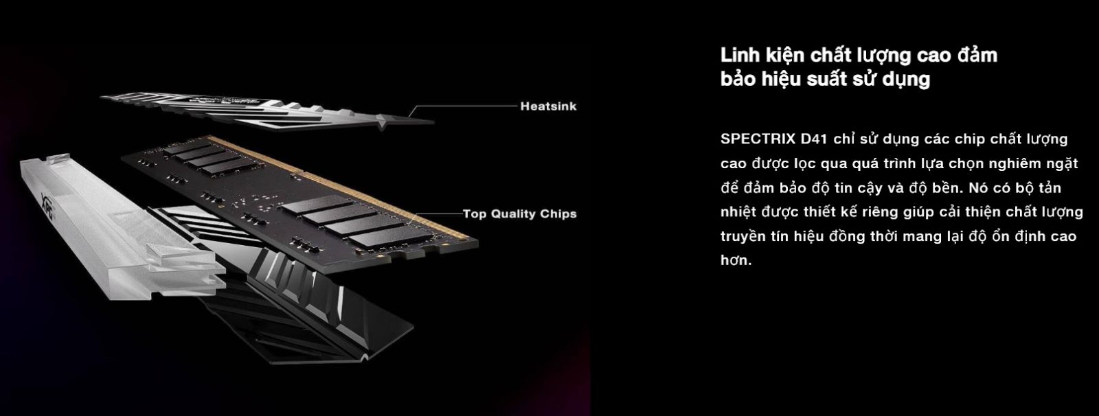 Adata XPG Spectrix D41 RGB chỉ sử dụng chip chất lượng cao, được lựa chọn thông qua quá trình lựa chọn nghiêm ngặt để đảm bảo độ tin cậy và độ bền. Nó có bộ tản nhiệt được thiết kế tùy chỉnh giúp cải thiện chất lượng truyền tín hiệu đồng thời tăng độ ổn định.