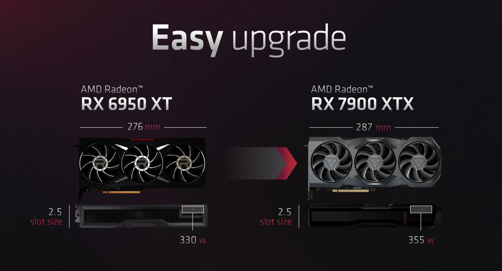 Cả hai card này đều được thiết kế theo kiến trúc RDNA 3 mới nhất của hãng. Tại sự kiện diễn ra ở Las Vegas, tiến sĩ Lisa Su, cũng là CEO của AMD cho biết phần cứng mới này của hãng có hiệu năng trên mỗi watt tăng 54% so với các đời trước. Bà cũng nhấn mạnh rằng sản phẩm mới của AMD sẽ đem đến đa hiệu năng với mức sử dụng điện hợp lý hơn, có vẻ nhằm ám chỉ đến việc ngốn điện khủng khiếp của Nvidia RTX 4090.