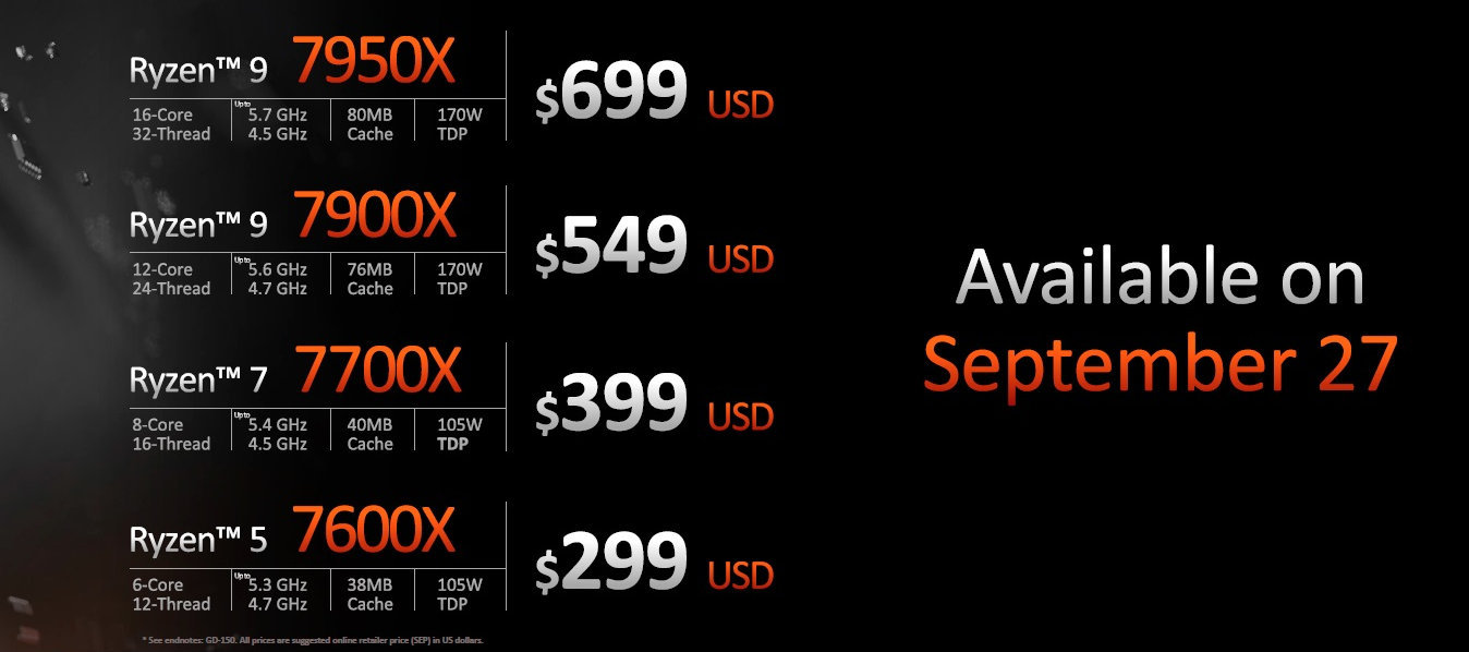 Cuối cùng là về giá và ngày ra mắt. AMD cho biết Series 7000 sẽ được chính thức lên kệ từ 27/9 sắp tới với giá từ 299 đô la cho Ryzen 5 7600X.