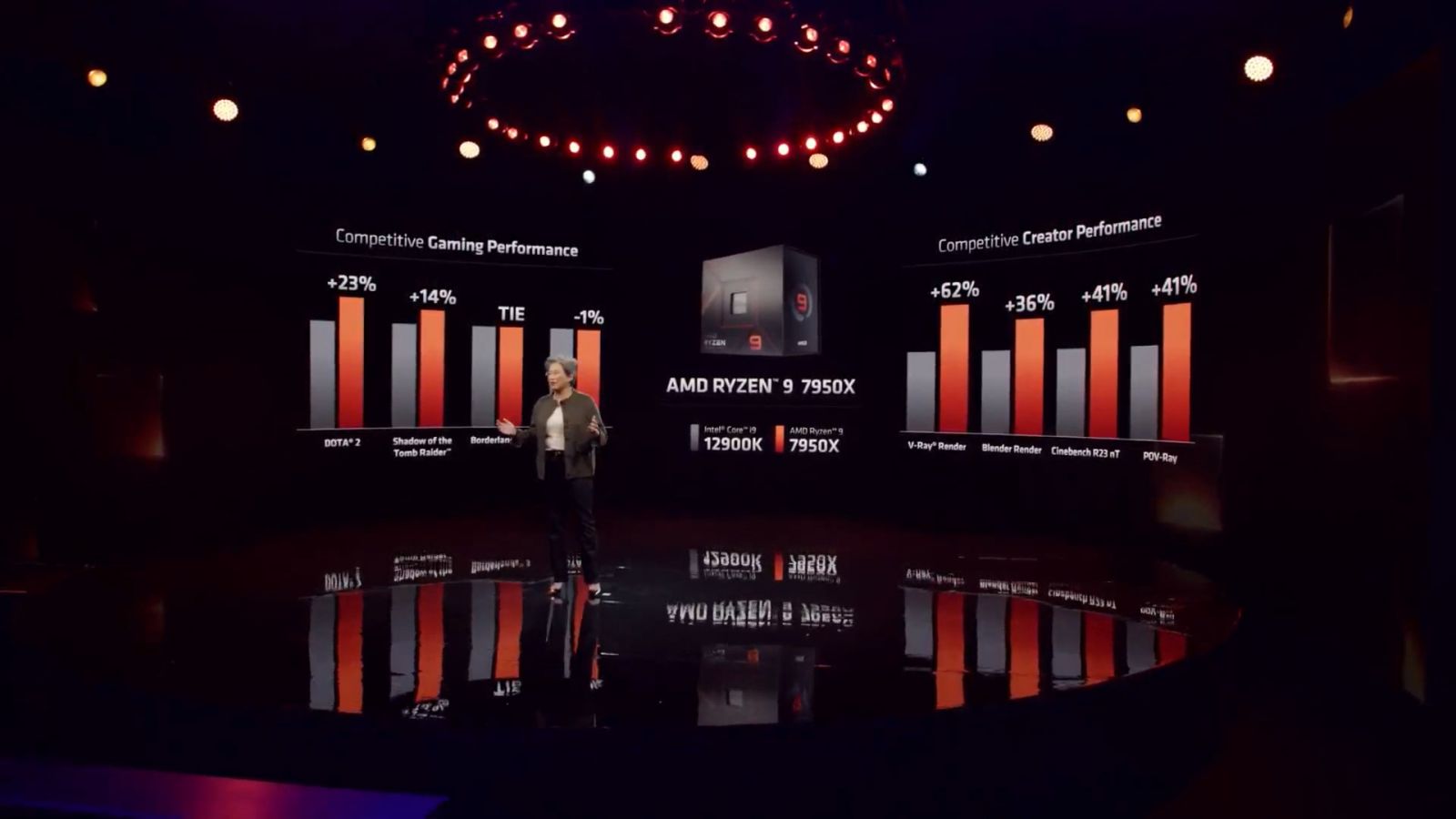 AMD cũng khẳng định Ryzen 7950X sẽ là một trong những mẫu CPU hỗ trợ chơi game hàng đầu thế giới hiện nay với mức tăng IPC 13% và xung nhịp boost cực cao, lên đến 5,85 GHz, (tăng gần 1 GHz so với Zen 3 5950X). Công ty còn không ngần ngại tuyên bố đích danh rằng bản thân Ryzen 5 7600X cũng đã mang đến trải nghiệm chơi game tốt hơn Core i9-12900K, chứ chưa cần tới Ryzen 9 7950X. Trên thực tế, Ryzen 9 7950X hoàn toàn có thể trở thành một con quái vật về mặt hiệu năng chơi game với tốc độ xung nhịp lớn cùng lõi "Persephone" Zen 4 hoàn toàn mới.