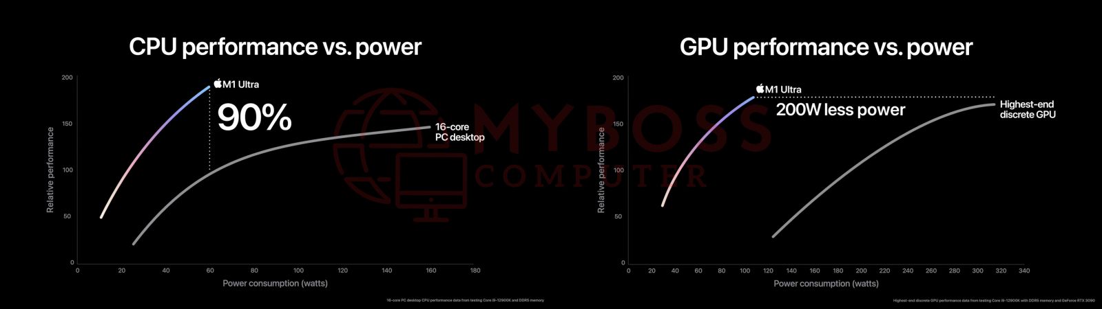 Đi sâu hơn vào những so sánh về hiệu năng, Apple tuyên bố rằng M1 Ultra có thể mang lại hiệu suất cao hơn tới 90% so với Core i9-12900K - mẫu CPU máy tính để bàn hàng đầu hiện tại của Intel - ở cùng công suất tương tự, trong khi tiêu thụ điện năng ít hơn 100W. Con chip này cũng được cho là có thể cung cấp hiệu suất cao hơn 90% so với chip Intel Xeon 16 lõi, và nhanh hơn 2,5 lần so với CPU máy tính để bàn Intel Core i9 10 lõi. Tuy nhiên các model so sánh cụ thể không được đề cập.