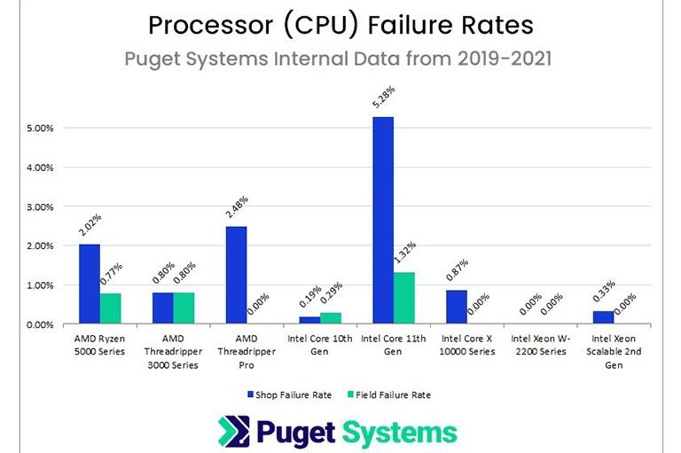 Cuối năm ngoái, hãng Puget Systems đã đăng tải báo cáo "Phần cứng PC đáng tin cậy nhất năm 2021". Báo cáo này dựa trên tỷ lệ hỏng hóc của phần cứng PC để đánh giá độ tin cậy của chúng. Phần đánh giá bao gồm các thành phần bộ xử lý (CPU), card đồ họa, bộ nhớ và ổ lưu trữ (SSD/HDD). Trong số này, khi nói đến CPU, công ty xem xét đánh giá bộ phận CPU cho máy tính để bàn phổ thông và máy tính để bàn cao cấp (HEDT).
