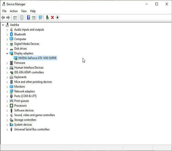 3. Trong phần Display adapters, nhấp đúp vào driver Nvidia. Tùy thuộc vào kiểu card đồ họa Nvidia bạn có, bạn có thể thấy một mục khác. Ngoài ra, nếu bạn có nhiều driver đồ họa, bạn có thể thấy nhiều mục nhập ở đây.