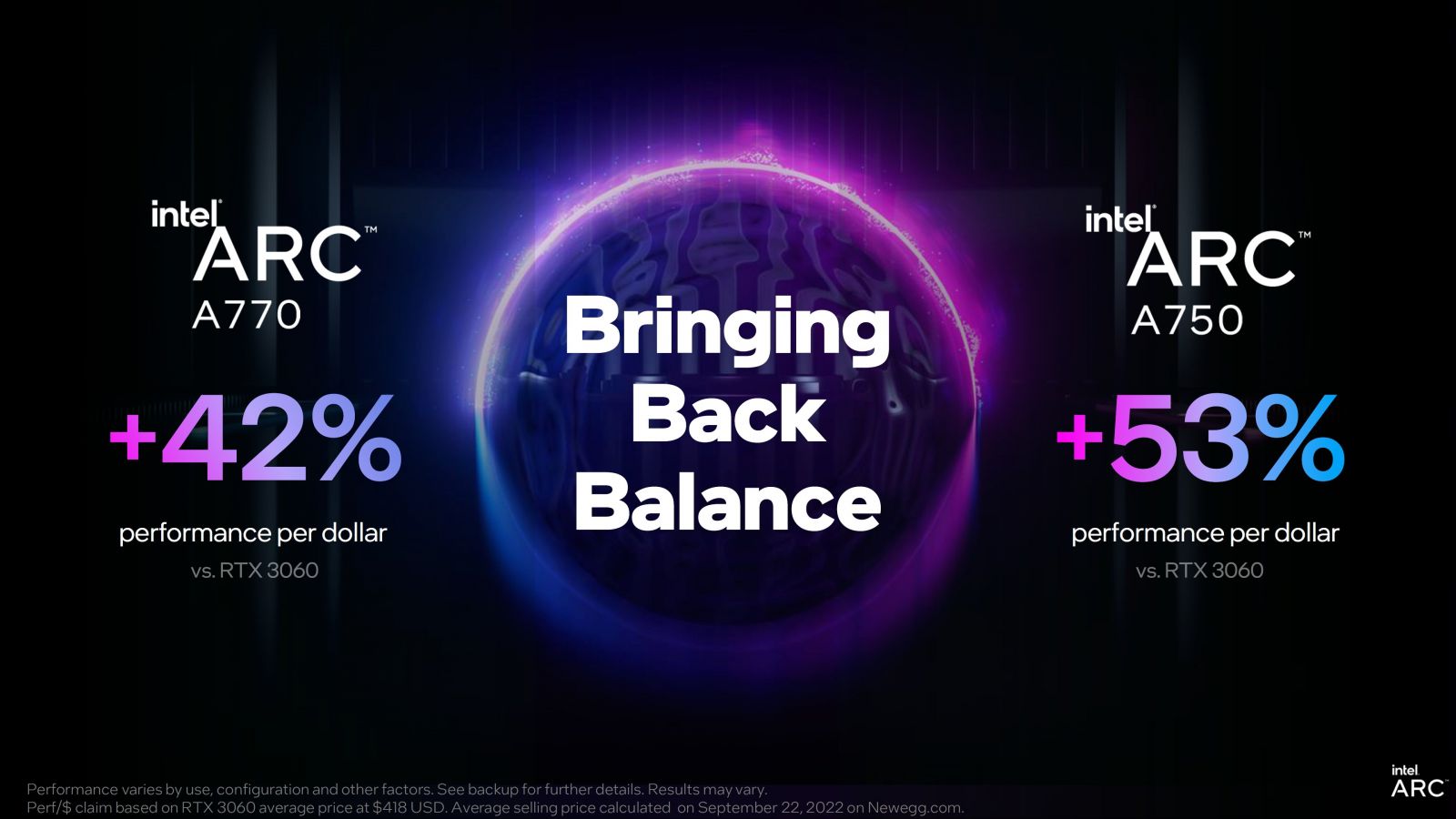 Không cung cấp nhiều thông tin về cách so sánh điểm chuẩn thuần túy, bài thuyết trình của Intel đã đề cập rằng Arc A770 có “hiệu suất cao nhất tốt hơn 65%, so với sự cạnh tranh về Ray-Tracing”. Tuy nhiên, mẫu GPU, và trò chơi được sử dụng ở bài thử nghiệm này, không được công bố, mặc dù trước đây Intel đã so sánh hiệu suất Ray-Tracing của Arc A770 với RTX 3060 của Nvidia.