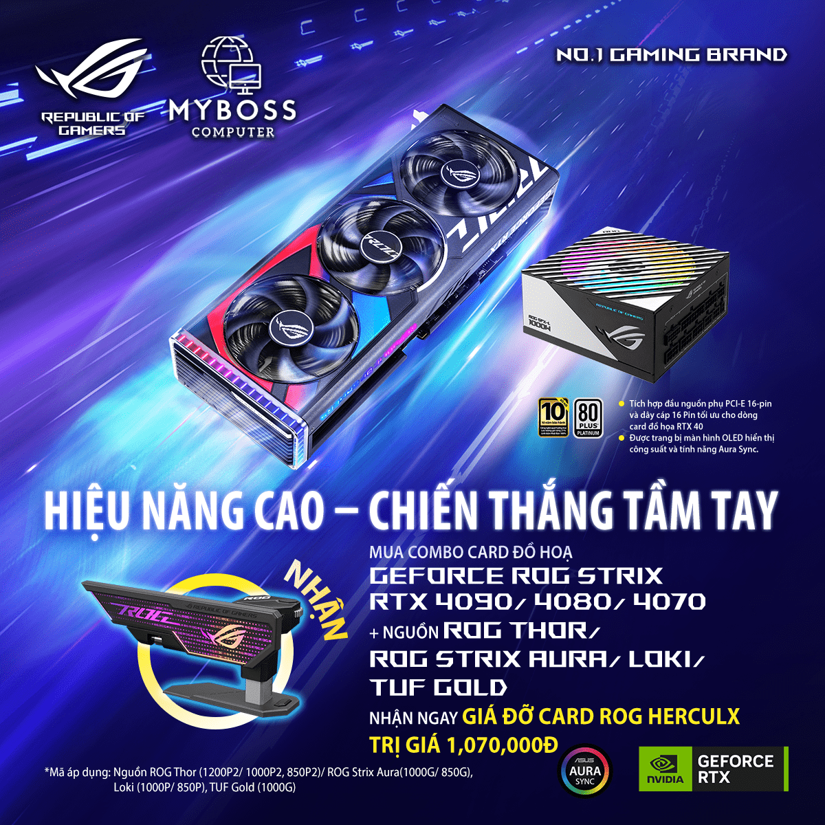 • Tặng giá đỡ card ROG HERCULX trị giá 1,040,000đ khi mua Card đồ hoạ ROG Strix 4090/ 4080/ 4070 series + Nguồn ROG Thor (1200P2, 1000P2, 850P2)/ ROG Strix Aura (1000G/ 850G)/ ROG Loki (1000P/ 850P)/ TUF Gold (1000G)