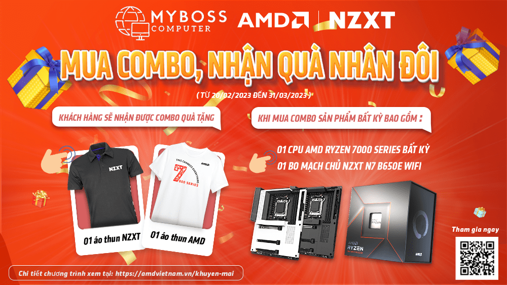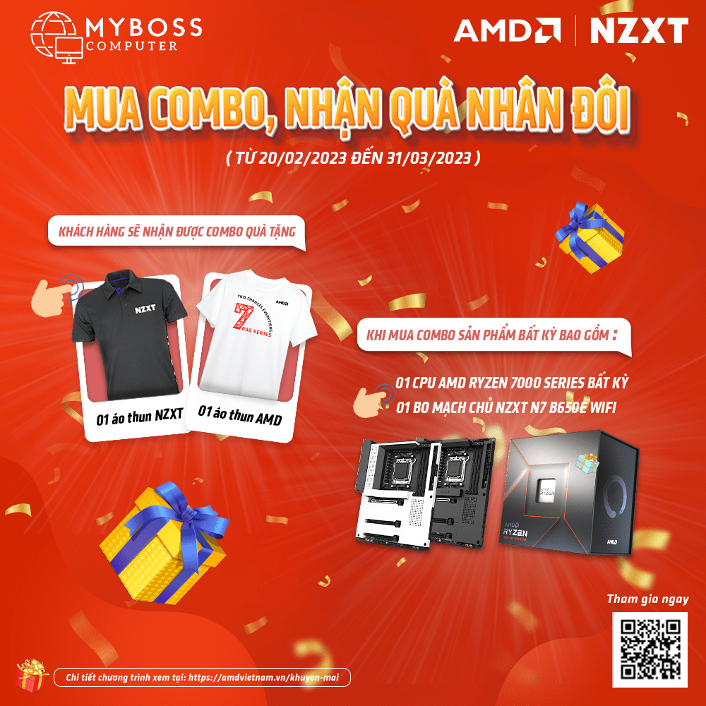 MYBOSS phối hợp cùng AMDxNZXT hân hạnh gửi tới quý khách chương trình khuyến mại “MUA COMBO, NHẬN QUÀ NHÂN ĐÔI”. Tặng ngay Combo quà ĐỘC QUYỀN khi khách hàng mua các sản phẩm CPU AMD cùng Bo Mạch Chủ NZXT theo quy định.