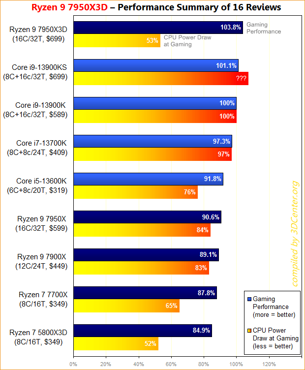 Khi nói đến mức tiêu thụ điện, vấn đề với 13900K là mức tiêu thụ điện năng của nó cực kỳ lớn và mặc dù bạn có thể điều chỉnh mức giới điện năng tiêu thụ, nhưng điều đó sẽ làm giảm hiệu suất. Vì vậy, trong khi 13900K/KS đã đẩy tổng mức tiêu thụ của hệ thống xuống chỉ còn 500 watt, thì 7950X3D có thể chạy thoải mái dưới 300 watt, sử dụng ít điện năng hơn cả i5-13600K.