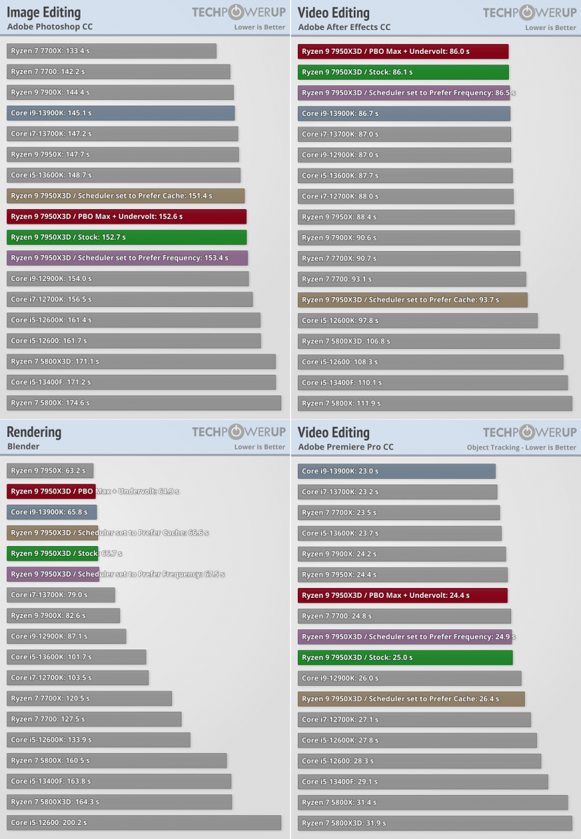 Đối với các ứng dụng có luồng nhẹ, chẳng hạn như Adobe Photoshop 2022, 7950X3D có thể chậm hơn một chút so với 13900KS. Ví dụ ở đây, nó chậm hơn 11% và chậm hơn 3% so với 7950X tiêu chuẩn.