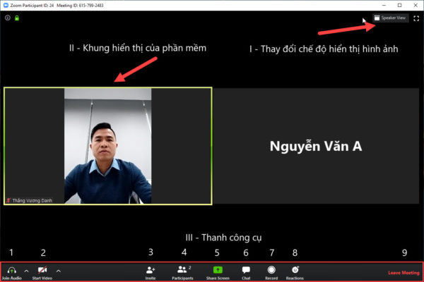 Các tính năng điều khiển cuộc họp sẽ được hiển thị ở cuối cửa sổ, trong khi nguồn cấp dữ liệu video từ những người gọi khác sẽ được hiển thị ở trên cùng. Phần chính giữa cửa sổ được dành riêng cho người dùng mà Zoom phát hiện đang nói chuyện hoặc tạo ra nhiều âm thanh nhất. Điều này giúp mọi người trong nhóm tập trung vào người này.