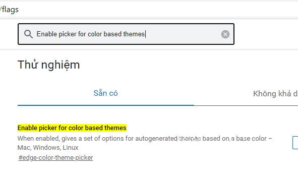 Sau đó, trong giao diện như hình dưới đây bạn nhập từ khóa Enable picker for color based themes để tìm đến flag.