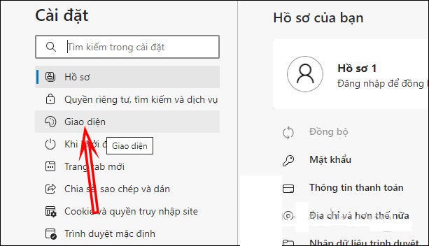 Sau khi khởi động lại trình duyệt chúng ta nhấn vào phần Cài đặt > Giao diện để thay đổi giao diện trên trình duyệt Microsoft Edge.